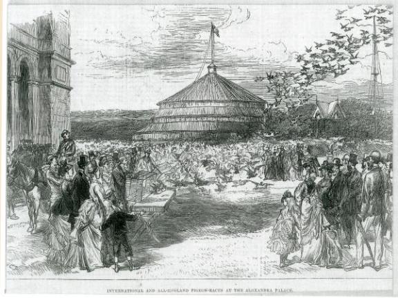Tegetmeier was also a pioneer of pigeon racing. He organised the first international pigeon race in 1871, and carried on organising pigeon races from Alexandra Palace, beginning in 1875. Below is an illustration which shows one of those events at Alexandra Palace – clearly extremely popular judging by the crowds, and attracting a range of people including families.