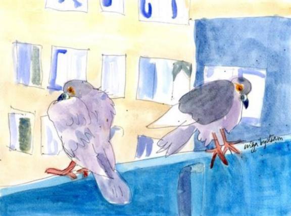 This little painting (below) by Inga Bystram shows her love of pigeons. She has captured their characters in her artwork, as they nestle on the balconies near her home on the Broadwater Farm estate: