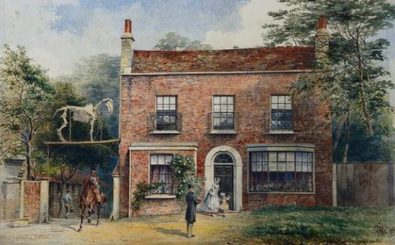 The beautifully painted watercolour (above) shows Turner’s House near the High Cross, Tottenham in 1881. The artist has paid great attention to the exquisite details of this semi-rural scene. This snapshot of everyday life (for some) in Victorian Tottenham shows an elegantly-dressed group who are either visiting the house or returning home; a horse-rider (presumably a huntsman, judging from their attire) emerges from the side entrance to the stables beyond, a stable-worker carries a bucket and a skeleton of a horse can be seen positioned high over the gateway to the stables.