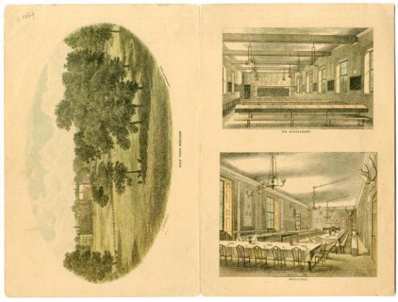Bruce Castle School brochure showing the Big Schoolroom (today’s Lecture Hall with its large windows we know so well), and the Refectory (nowadays the main Reception area and Gallery; the maid on the left just disappearing through a door, is where the main entrance door is today)