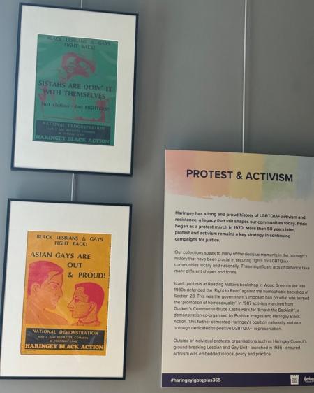 In another smaller room within the Museum was an exhibition on queer history, documenting queer protest, activism, and community in the borough of Haringey. One visual particularly stood out to me – a poster publicising a 1987 demonstration by Haringey Black Action and Positive Images. The poster reads ‘Black Lesbians & Gays Fight Back!’ and ‘Asian Gays are Out and Proud!’. Through the placards I read about how local communities organised and resisted against both racist and homophobic discrimination, in connected and tactful ways.