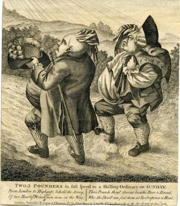 Back in 1780, these two ‘cits’ or City gentlemen were talked about for their very long trudge up Highgate Hill in this published satirical print. It would seem they are pounding up the hill as quickly as they can - raising dust clouds in the process whilst mopping their brows and head - to ensure they get to the tavern in time to claim their 18th century equivalent of a ‘meal deal’. The legend below says: